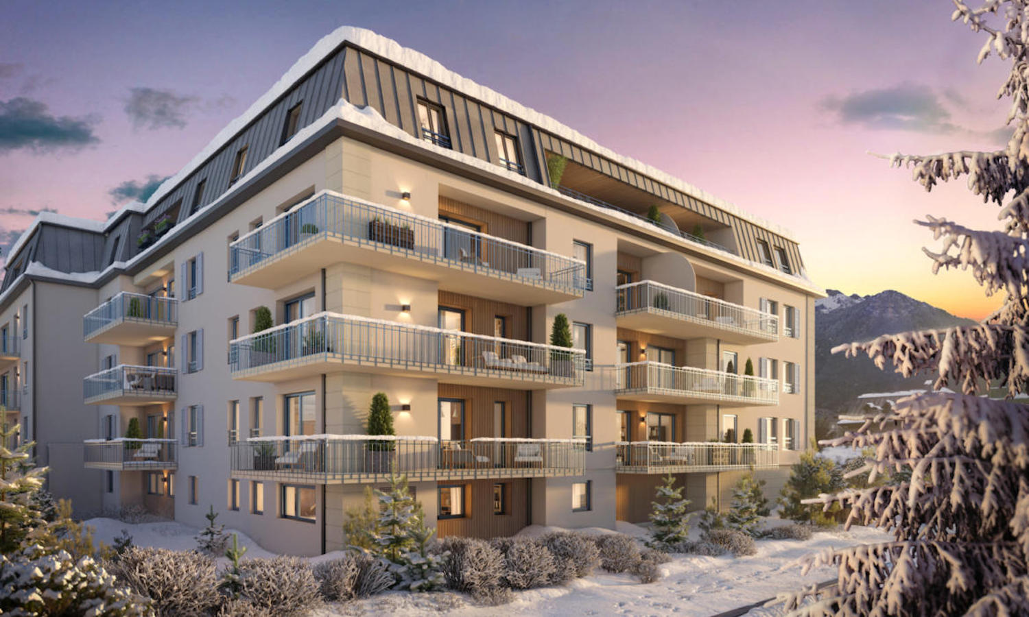 Ses superbes balcons laissent entrer la lumière chamoniarde dans tous les appartements.