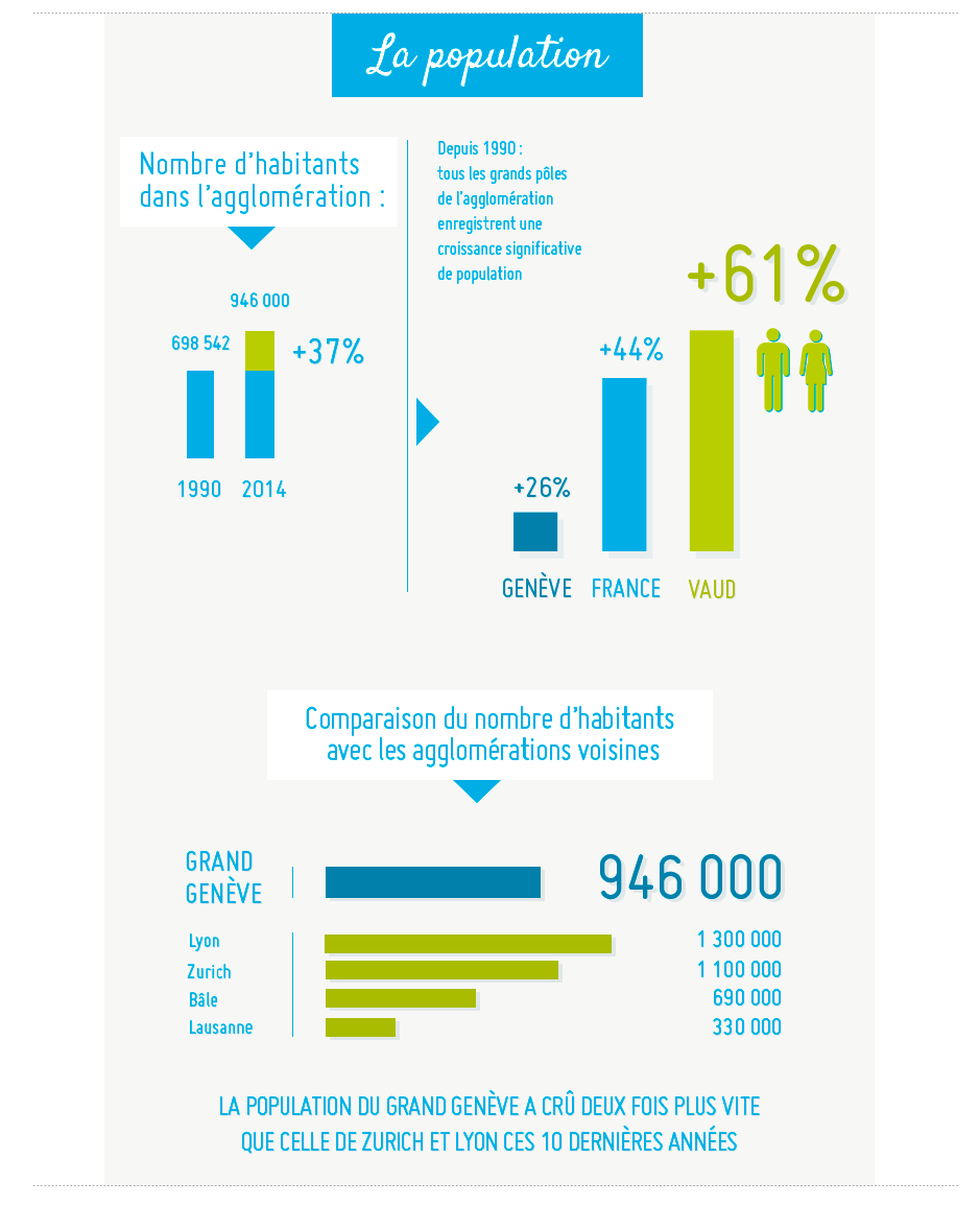 La population du Grand Genève ne cesse de croître (+37% entre 1990 et 2014) et le cap symbolique du million d’habitant devrait être franchi en 2017 et est déjà considéré comme la deuxième agglomération de Rhône-Alpes