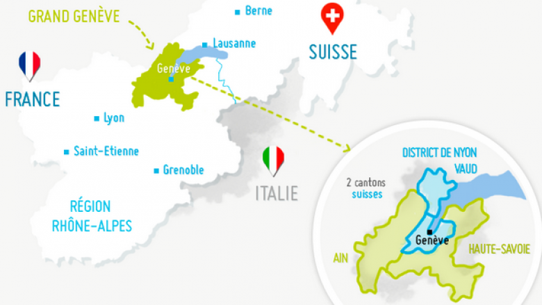 Anciennement espace transfrontalier Franco-Valdo-Genevois, le Grand Genève s’étend sur le district de Lyon, le canton de Genève, l’Ain et la Haute-Savoie.