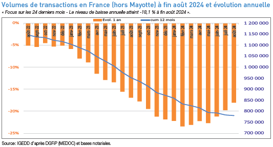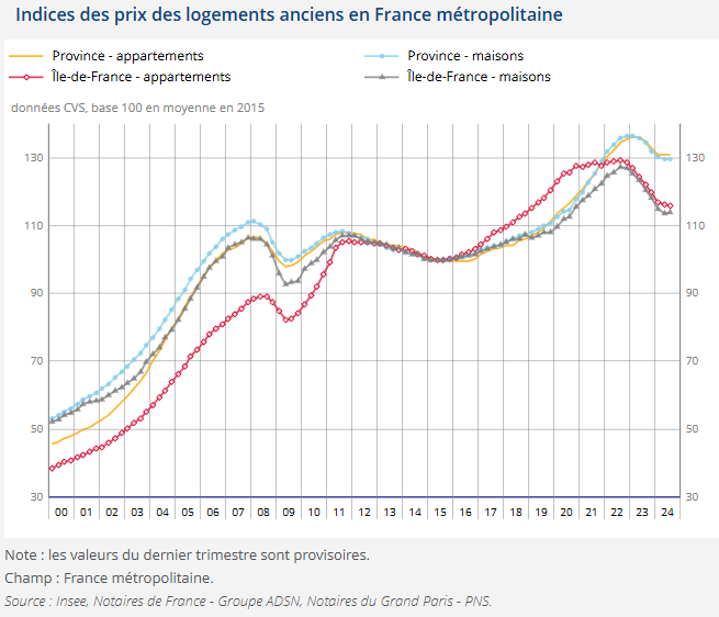 Cette éclaircie est aussi soutenue par des prix en baisse. Les relevés des notaires sont éloquents : les prix des logements anciens (appartements comme maisons) baissent pour le quatrième trimestre consécutif sur un an, à -3.9 % au 3e trimestre 2024 en France métropolitaine.