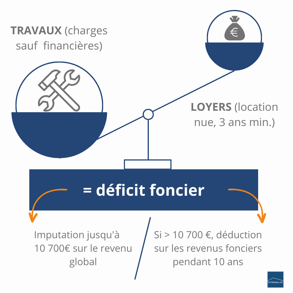Quand on investit en déficit foncier on se porte acquéreur d’un “stock de travaux déductibles” de ses revenus fonciers.
