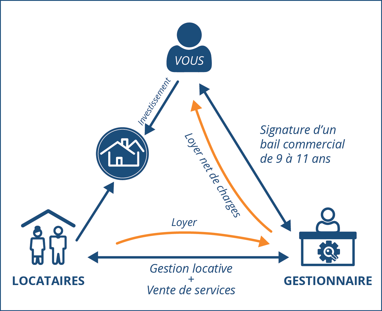 Engagé envers vous par un bail commercial de 9 à 11 ans reconductible, il deviendra alors votre locataire via sa société d’exploitation et proposera ensuite lui-même votre bien à la location accompagné de ses services.