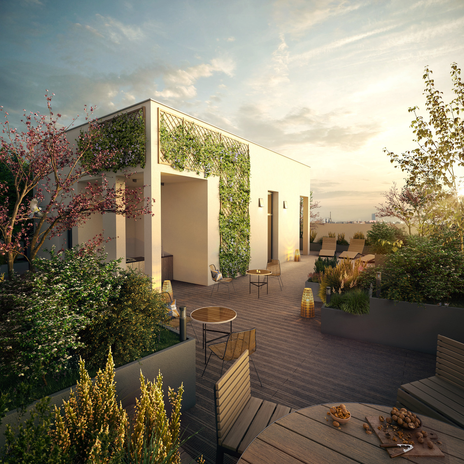 • Une toiture-terrasse partagée et paysagère à disposition de la copropriété et de ses résidents au R+16, avec cuisine, sanitaire, tables, bancs et chaises longues fixes