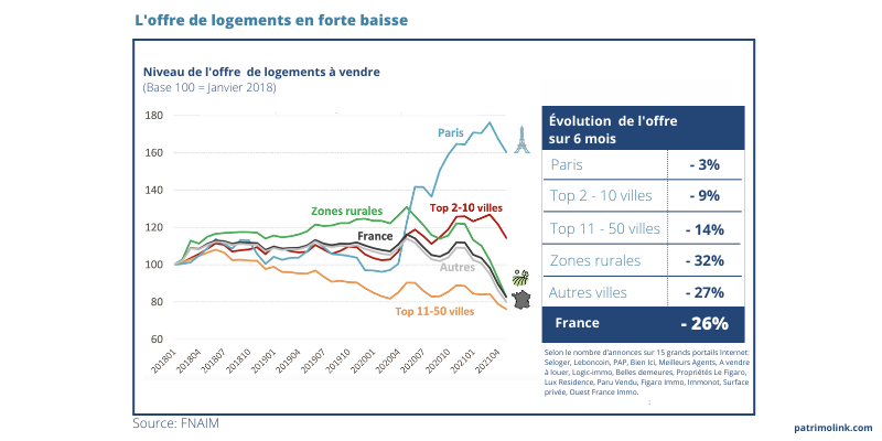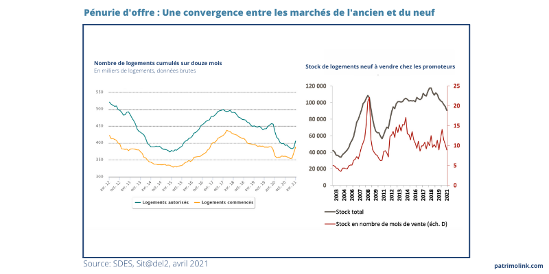 Même si la France connait depuis de nombreuses années un manque crucial de logements et ceci depuis la période après-guerre, cette tendance ne s’est pas améliorée et devrait même s’accentuer davantage dans les années à venir. Pour cause, un recul significatif du nombre de mises en chantiers (-6,9% en 2020 par rapport au douze mois précédents) et de délivrance de permis de construire (-14,7%). Selon les dernières données de la Fédération française du bâtiment (FFB), la production de logements neufs afficherait un net recul de 22,3 % en 2020. Le stock de logements à vendre est au plus bas poussant ainsi les prix de l’immobilier à la hausse.