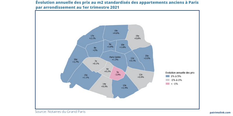 Avec des prix moyens très disparates selon les quartiers, l’immobilier Parisien affiche une faible augmentation de 1.7% par rapport aux douze mois précédents. Sur les 20 arrondissements Parisiens, seuls 14 connaissent une évolution annuelle supérieur à 1%. Les six autres affichent une croissance proche de zéro voire négative.