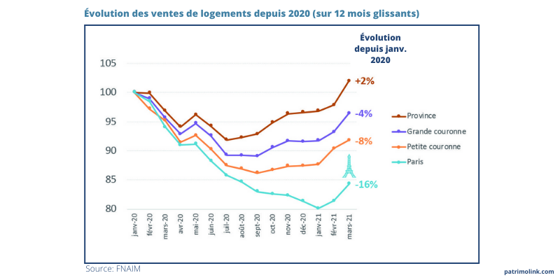 En outre, cette hausse des transactions n’est pas observée de manière égale sur tout le territoire. En effet, elle semblerait davantage viser les villes de provinces qui selon la FNAIM, auraient connu fin mars 2021 une augmentation de 2% des transactions sur la période des 12 derniers mois. A l’inverse, Paris et l’IDF ont été plus sévèrement touchés et affichent des baisses respectives de ventes de logements de -16% et -12% (dont – 4% dans la Grande Couronne et -8% dans la Petite Couronne). Les Notaires de France confirment cette nouvelle tendance en affirmant que cette hausse des transactions se serait faite « au profit d’une nouvelle typologie de biens et vers des zones géographiques qui s’éloignent des grandes villes. »