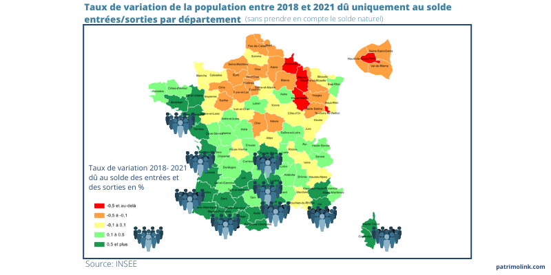 Les confinements successifs et la généralisation du télétravail ont accru la volonté de se rapprocher de zones moins densément peuplées (d’où la baisse du nombre de transactions à Paris et en IDF). On observe par conséquent une hausse de la demande de logements situés en banlieue ou en dehors des grandes villes, tout comme une hausse de la demande des maisons VS appartements. Le site des Notaires de France parle même de « relocalisation vers des petites villes et villes moyennes » dans des zones plus vertes où la typologie des biens permettrait d’avoir des surfaces plus grandes à des prix plus abordables. Dans une récente étude de l’INSEE, il est intéressant d’observer le taux de variation de la population entre 2018 et 2021 en tenant compte uniquement du solde des entrées et sorties des départements (et non du solde naturel). On constate alors une nette prédominance des migrations vers les départements du sud et du sud-ouest, là où les soldes migratoires positifs sont les plus élevés.