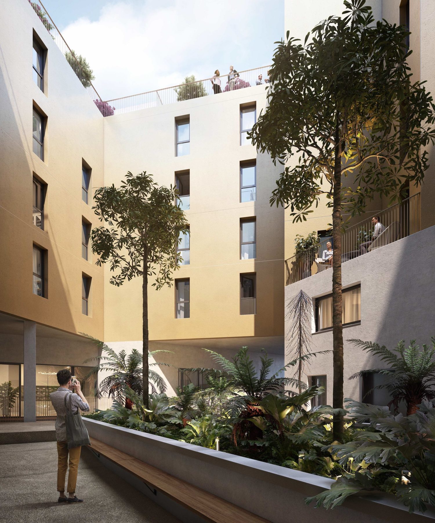 Comme en écho au parc et au mail arboré tout proche, le porche qui traverse la résidence révèle un patio généreusement planté d’essences d’aspect exotique.