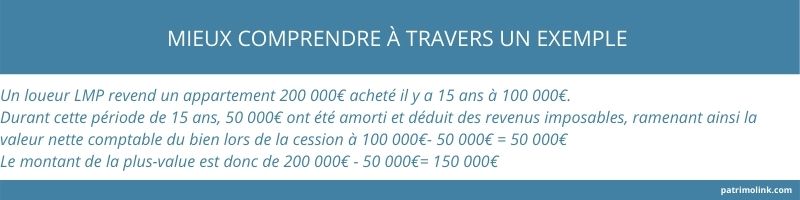 En cas de cession du bien loué sous le régime LMP, l’amortissement non déduit fiscalement est ajouté à la valeur nette comptable prise en compte pour le calcul de la plus ou moins-value de cession. Le montant de la plus-value relative à un bien amortissable est égal à la différence entre le prix de cession et la valeur nette comptable. Ainsi, les amortissements viennent majorer le gain imposable.