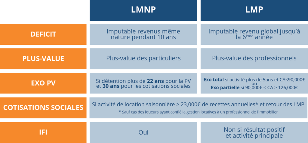 Que l’on parle du statut LMNP ou LMP, les loyers perçus seront, dans les deux cas, toujours imposés dans la catégorie des Bénéfices Industriels et Commerciaux (BIC). Il sera toujours possible d’amortir le bien et le mobilier ainsi que les travaux qui y sont effectués (sous le régime réel) et donc d’imputer cet amortissement* sur les revenus locatifs encaissés afin de réduire la base imposable. En revanche, les déficits de l’activité de la location meublée (charges réelles telles que frais de notaire, frais comptable, frais d’agence, etc…) sont traités différemment selon que l’on soit LMNP ou LMP.