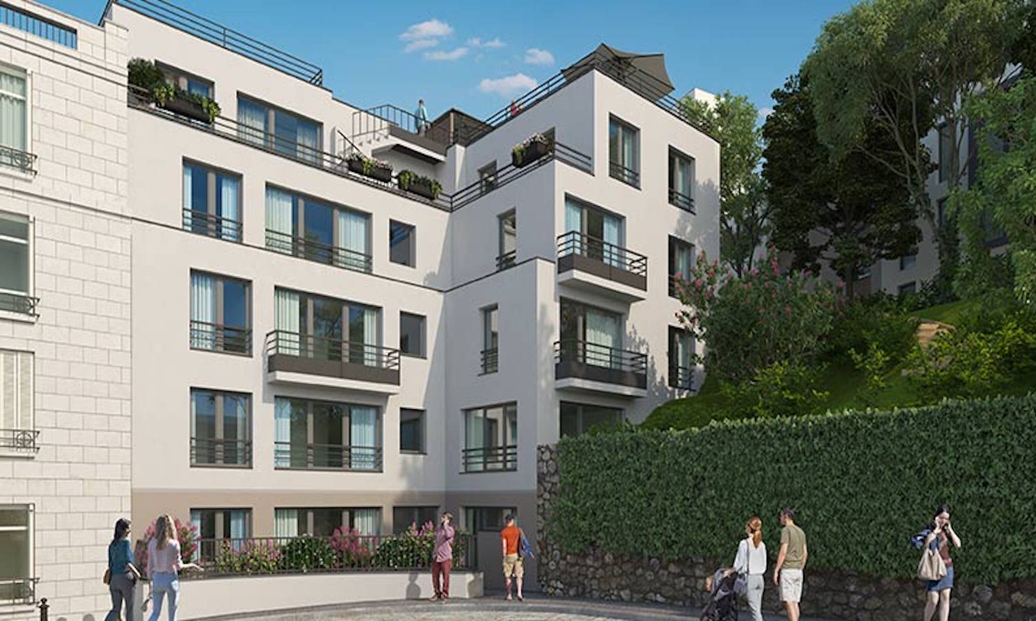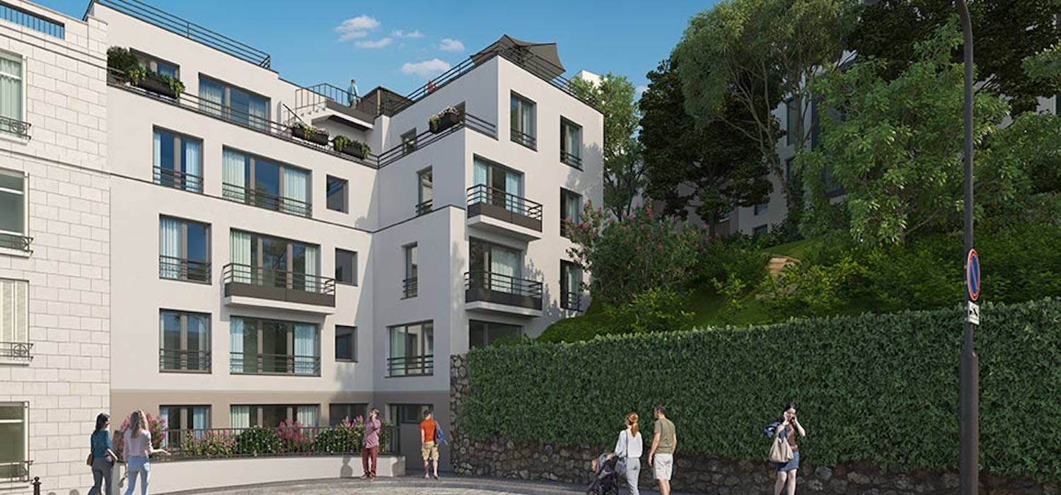 Petit bijou intime et rare, cette nouvelle résidence se niche dans un cadre verdoyant dans un des quartiers les plus confidentiels et atypiques de Paris, la Butte Bergeyre : esprit village, ruelles préservées, escaliers escarpés, jardin partagé.