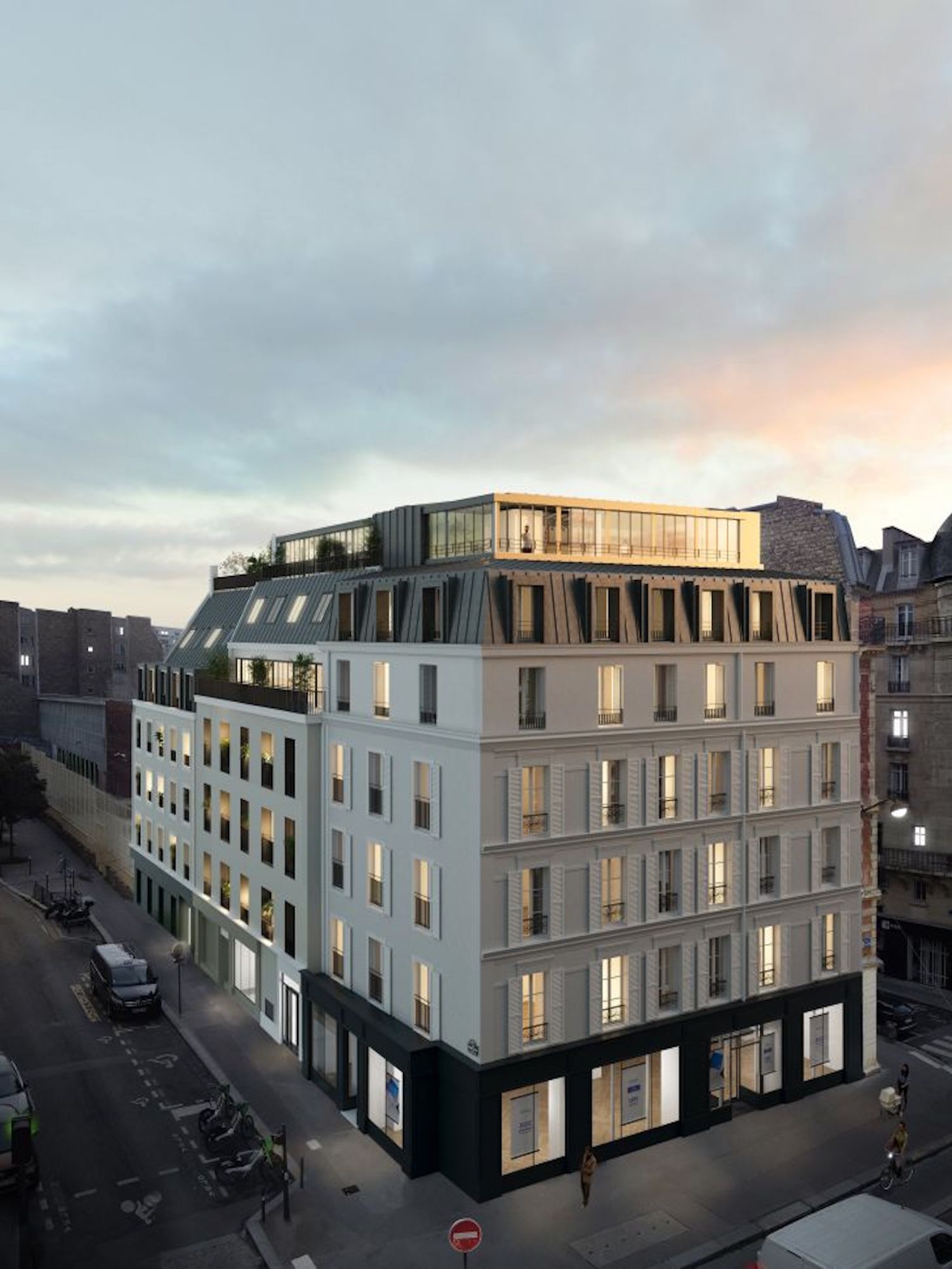 La résidence déploie une silhouette élégante subtilement métamorphosée et habillée de verrières en son sommet.