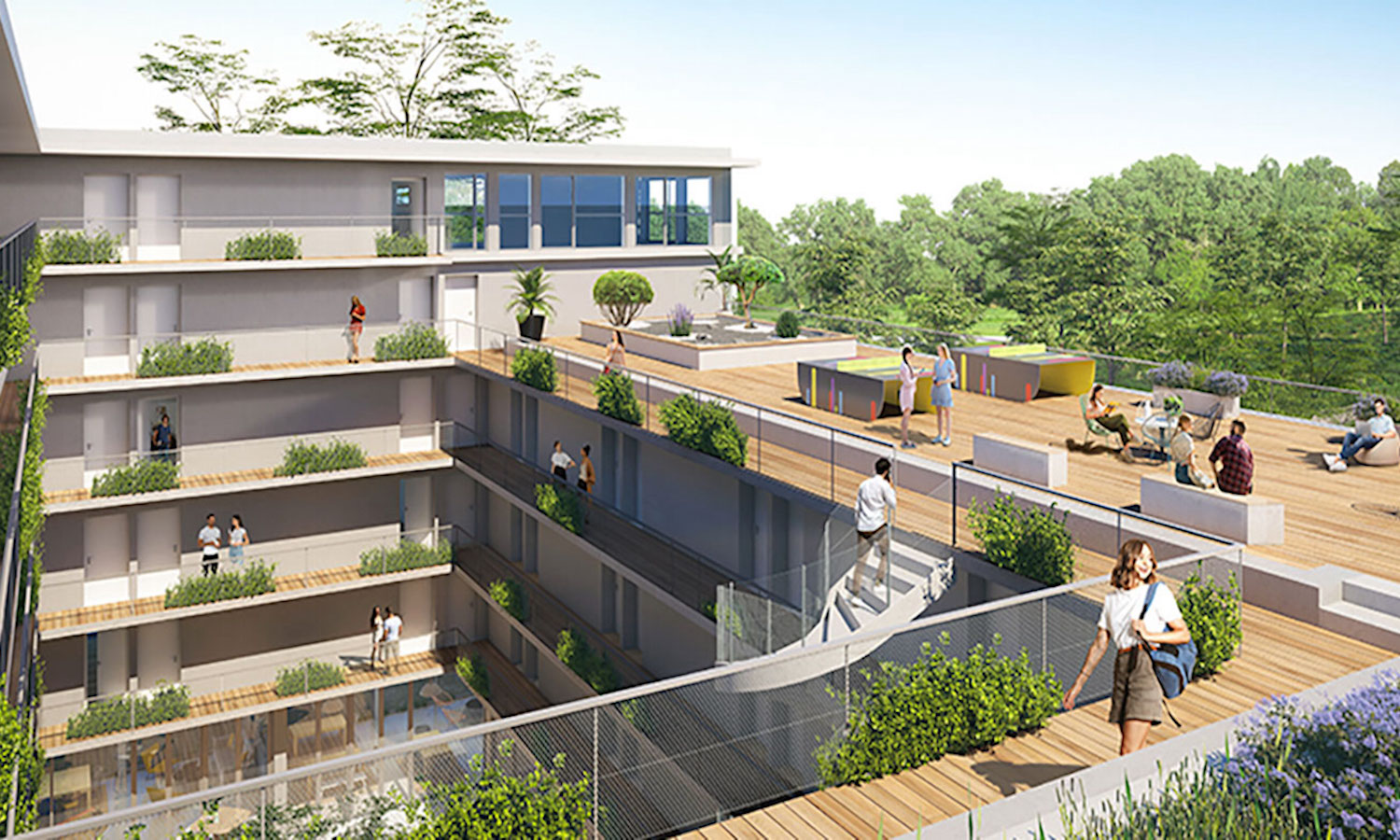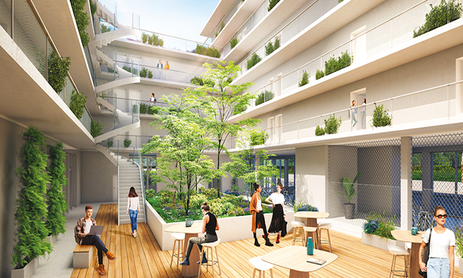 Les résidents disposent également d’une salle de sport indoor entièrement équipée aux 4ème et 5ème étages, d’un rooftop et d’un terrain de basket, ainsi que de 56 places de parking sécurisées, situés au sous-sol.
